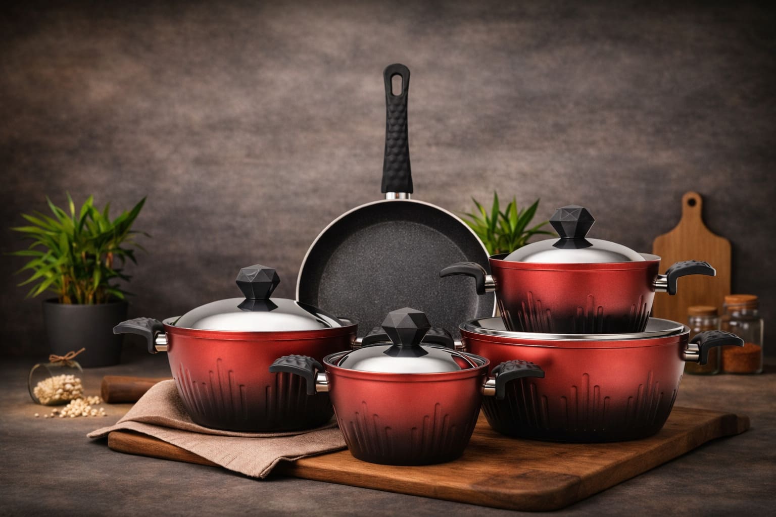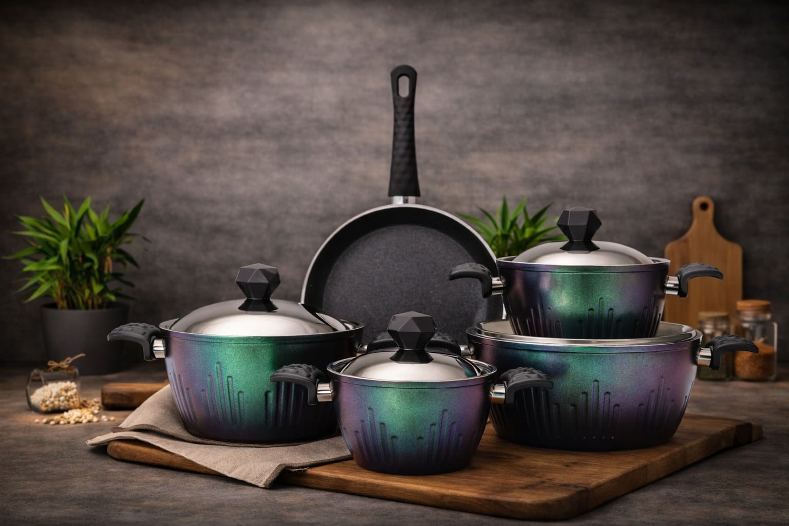 Günlük kullanım için dengeli ebatlar: 4 derin tencere + 1 tava. Teflon yapışmaz yüzey ile akışkan pişirme deneyimi ve pratik temizlik hedefleyen set.